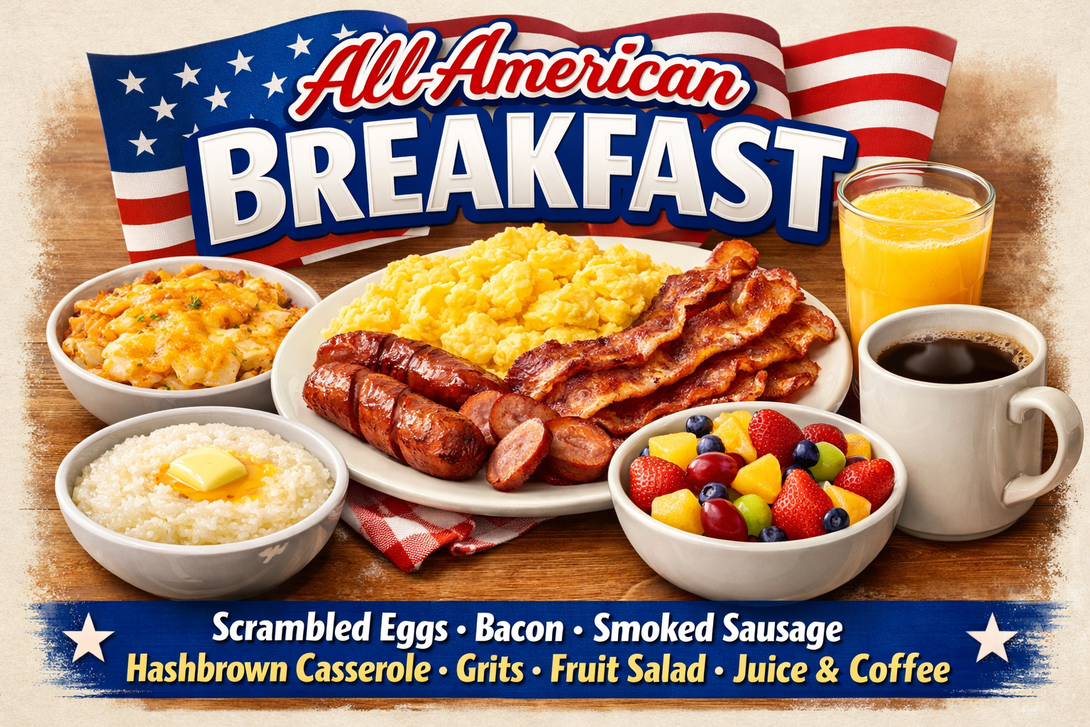 - Menu #1: Scrambled Eggs, Smoked Sausage, Bacon, Grits, Hashbrown Casserole, Biscuits, Fruit Salad, Coffee & Juices