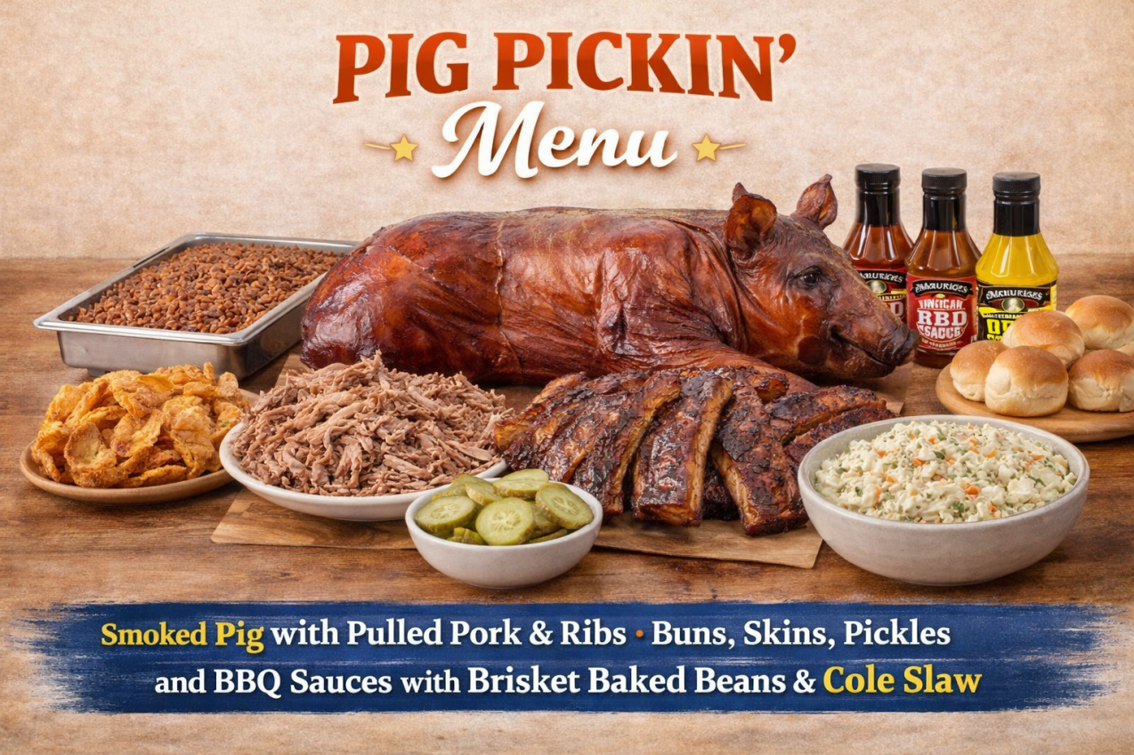 - Menu: Whole Smoked Pig with Pulled Pork, plus Buns, Skins, Pickles, and BBQ Sauces with Brisket Baked Beans & Cole Slaw