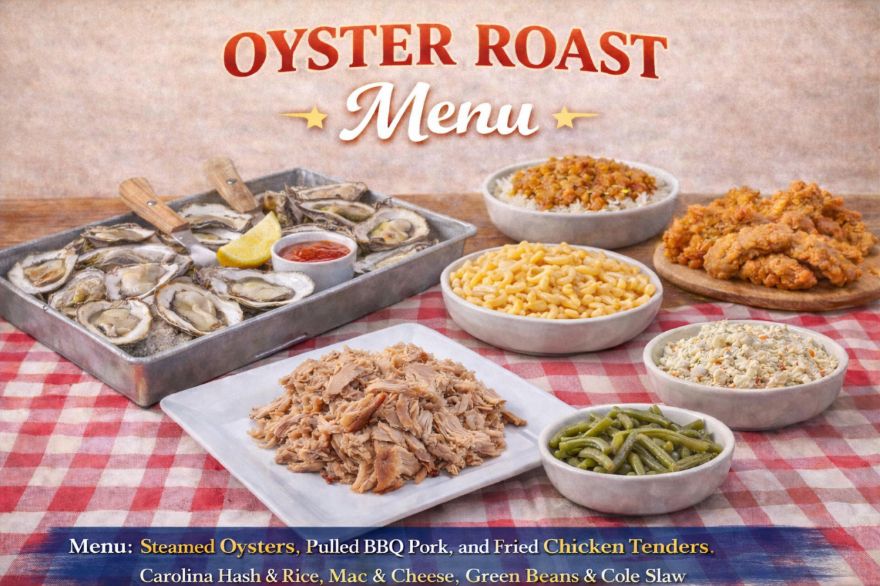 - Menu: Steamed Oysters, Pulled BBQ Pork, and Fried Chicken Tenders, Carolina Hash & Rice, Green Beans & Cole Slaw
