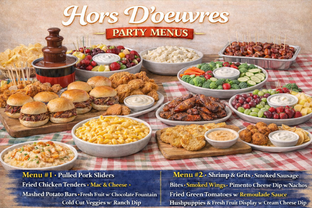 - Menu #2: Shrimp & Grits, Smoked Sausage Bites, Smoked Wings, Pimento Cheese Dip w/Nachos, Fried Green Tomatoes w/ Remoulade Sauce, Hushpuppies & Fresh Fruit Display w/Cream Cheese Dip