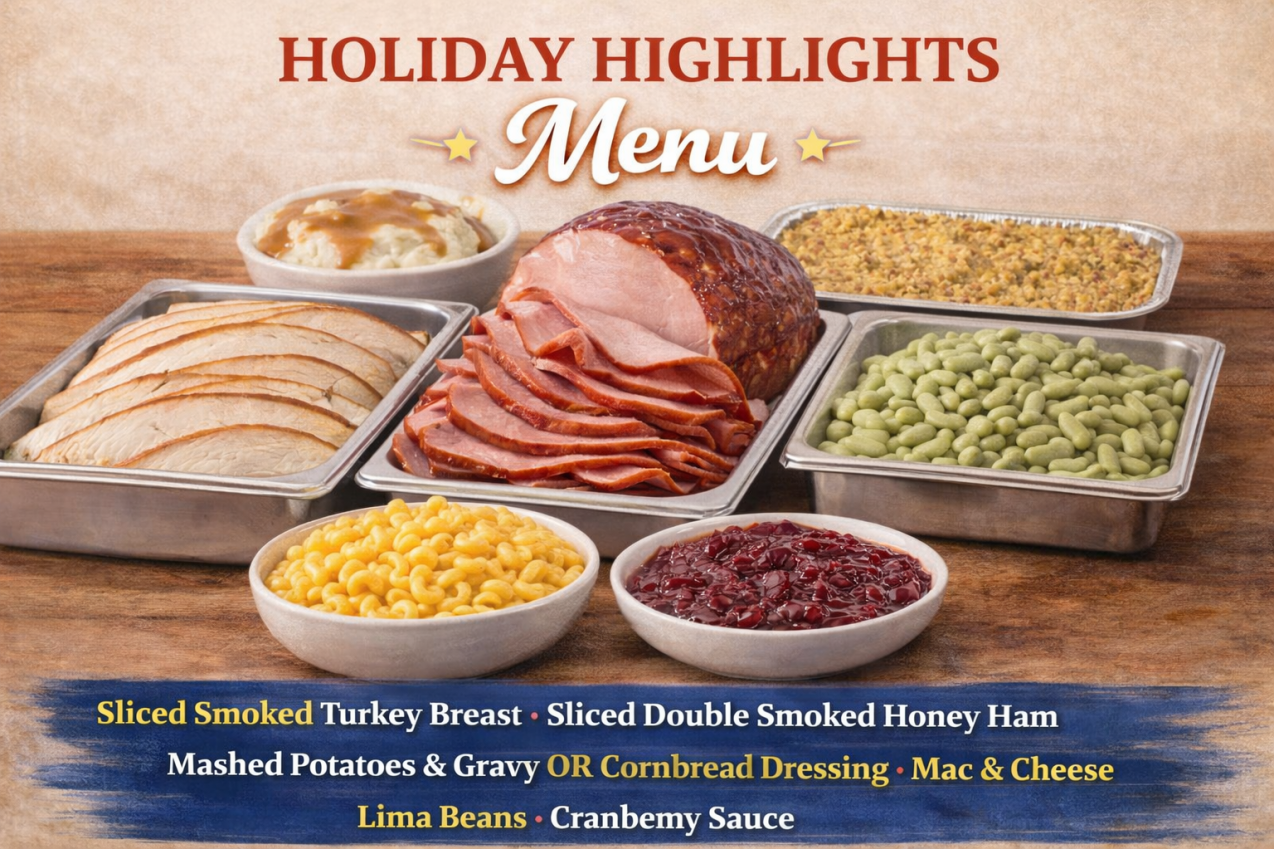 - Menu: Sliced Smoked Turkey Breast, Sliced Double Smoked Honey Ham, Mashed Potatoes & Gravy OR Cornbread Dressing, Mac & Cheese, Lima Beans, Cranberry Sauce