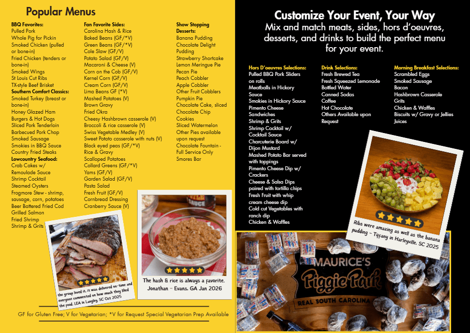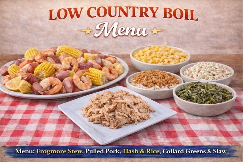 - Menu: Frogmore Stew, Pulled Pork, Collard Greens, Mac & Cheese & Slaw